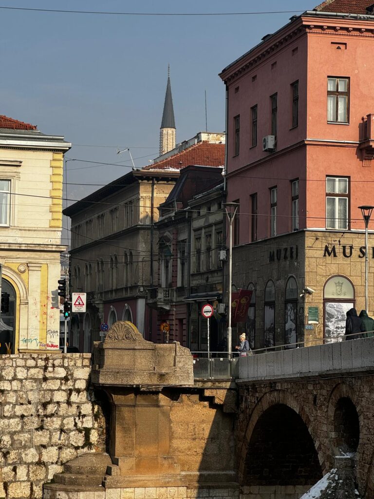 Pese a que ese lunes era día feriado, los negocios estaban abiertos, y en el café al que recalamos, a escasos minutos del hotel, pudimos percibir el Miljacka escarchado y con algunos montículos de nieve en las orillas. A pocos metros de donde saciamos el hambre y dosificamos el frío, le advertí a mi hijo que pisaríamos el mismísimo lugar donde fue asesinado el archiduque Francisco Fernando en 1914, y que no olvidara que días antes habíamos visitado la estatua de su asesino, Gavrilo Princip, en Belgrado, quien resultó ser, hoy en día, para bien o para mal, un desconocido, porque estuvimos ahí preguntándoles a los transeúntes si sabían quién era el personaje de la estatua: ¿un rapero?, ¿un romaní para reivindicar a los gitanos?, ¿la estatua del migrante desconocido? Nada.