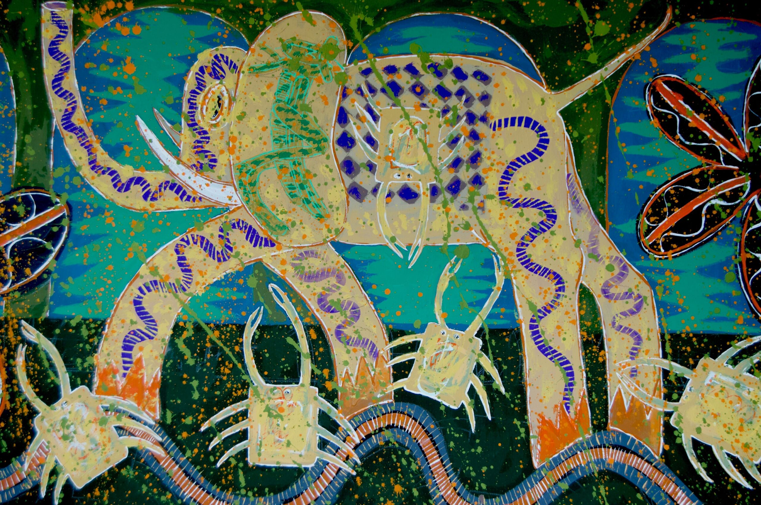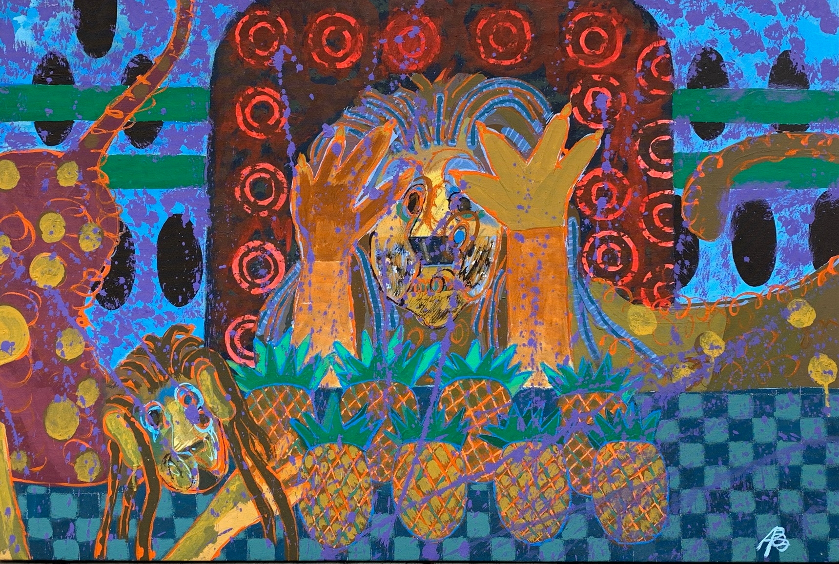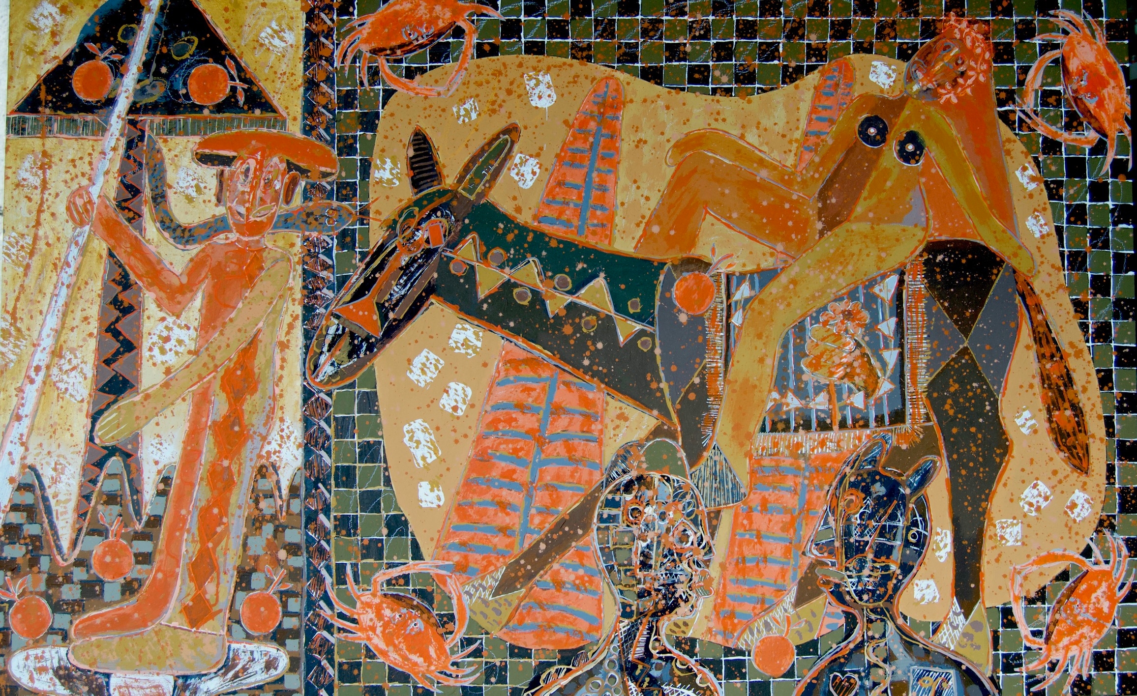 Tales contenidos en una obra pictórica deberían hacernos olvidar de la realización plástica, pero en realidad lo que hacen es realzarla, llevarla al primer plano. Porque estas imágenes, aunque figurativas, se escapan de cualquier realismo convencional: rostros carentes de rasgos, significados por rayones y manchas de color en apariencia anárquicas; figuras de animales cortadas como un totem, que al aparecer en la tela se vuelven de inmediato seres míticos: la serpiente, el camello, los caballos, las aves; un mundo tropical y barroco expresado con formas de diseño infantil, en el que la exuberancia nos envuelve, nos colma de placeres y sensualidad.