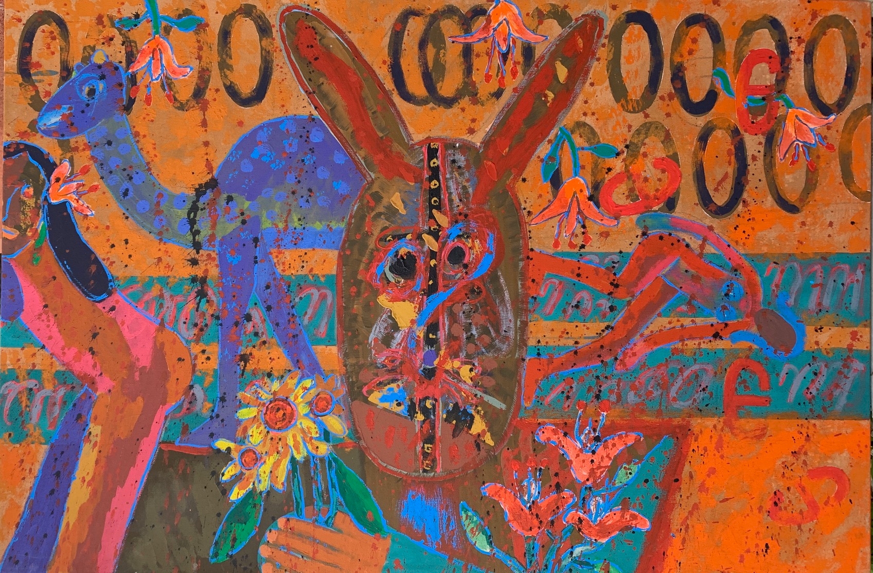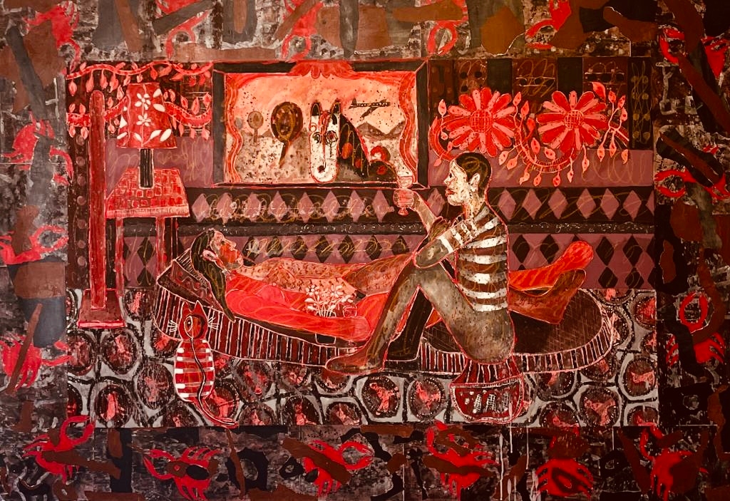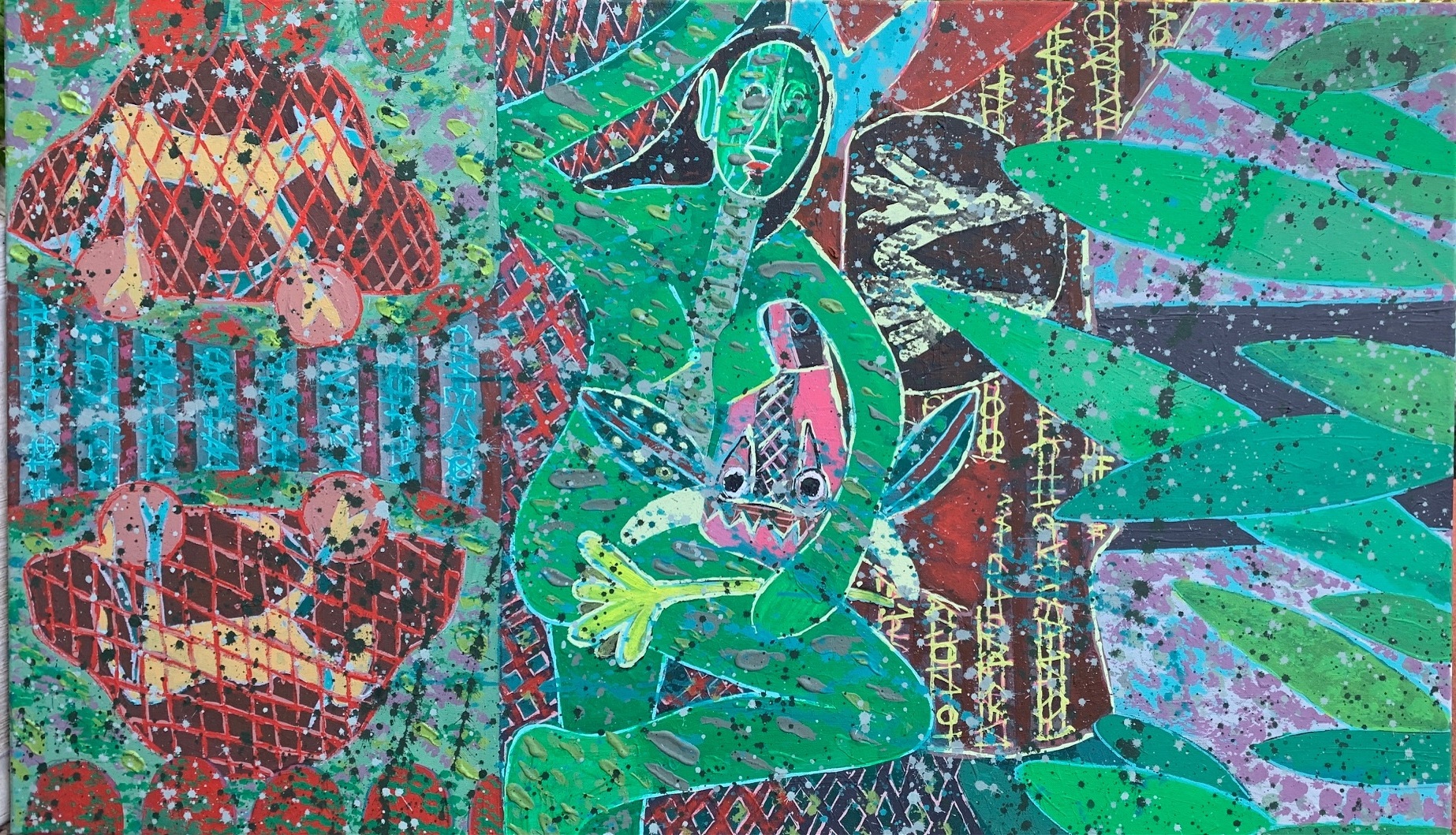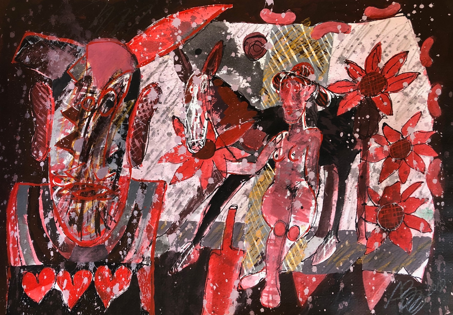 Tales contenidos en una obra pictórica deberían hacernos olvidar de la realización plástica, pero en realidad lo que hacen es realzarla, llevarla al primer plano. Porque estas imágenes, aunque figurativas, se escapan de cualquier realismo convencional: rostros carentes de rasgos, significados por rayones y manchas de color en apariencia anárquicas; figuras de animales cortadas como un totem, que al aparecer en la tela se vuelven de inmediato seres míticos: la serpiente, el camello, los caballos, las aves; un mundo tropical y barroco expresado con formas de diseño infantil, en el que la exuberancia nos envuelve, nos colma de placeres y sensualidad.