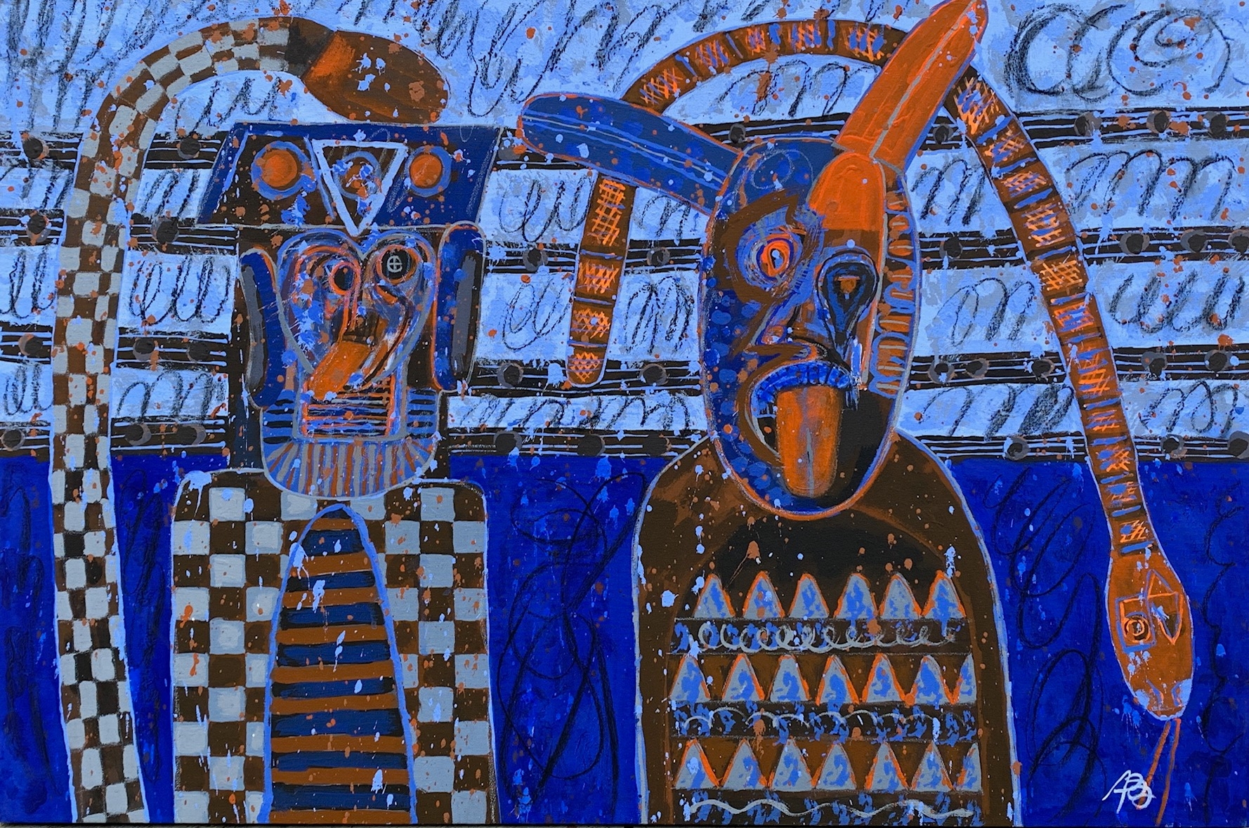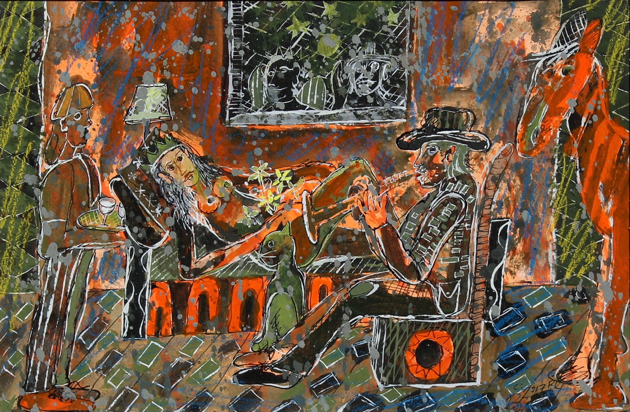 Nada en su pintura se apoya en cosas aprendidas o en gustos adquiridos. No hay referencias que nos permitan situar su obra. Sí, reconocemos una imaginería mexicana, sin lugar a duda; sí, hay un colorido en sus cuadros que evoca un universo de cuentos infantiles, de feria, de fiesta popular. Pero esos colores en apariencia ingenuos, casi siempre aplicados sin transparencias ni degradados, se van poblando con raspaduras, salpicaduras y trazos disruptivos que eliminan toda placidez, rompen el equilibrio visual para excitar más que deleitar. Y, si vemos al pintor en acción, nos percataremos de que esos “accidentes” del color son provocados con gestos dinámicos, nerviosos, o con cadencias que recuerdan el tañer un instrumento o la danza. Hay, pues, una energía corporal que interviene en la creación de las figuras, algo que les imprime un relieve visual complejo, barroco en ocasiones, en el que se expresa la sabiduría plástica de siglos de pintura, aunque se percibe como un rasgo de contemporaneidad, casi un grafiti.