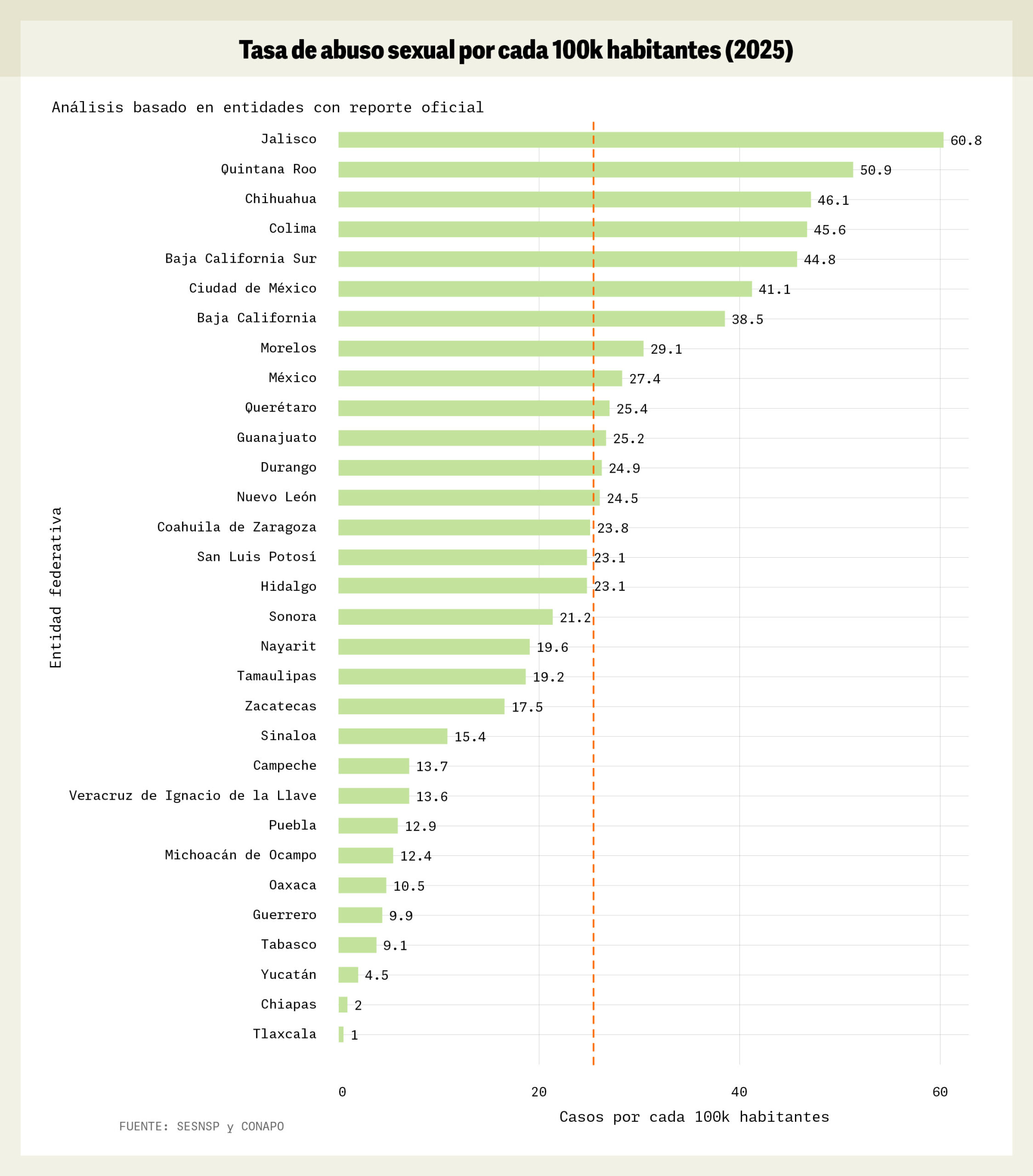 La gráfica muestra algo que vale la pena subrayar: once estados están por encima del promedio nacional de 24 casos. Sin embargo, es importante considerar variantes como la densidad de población y la eficacia de las fiscalías locales para registrar de forma correcta las denuncias para este tipo de delito.