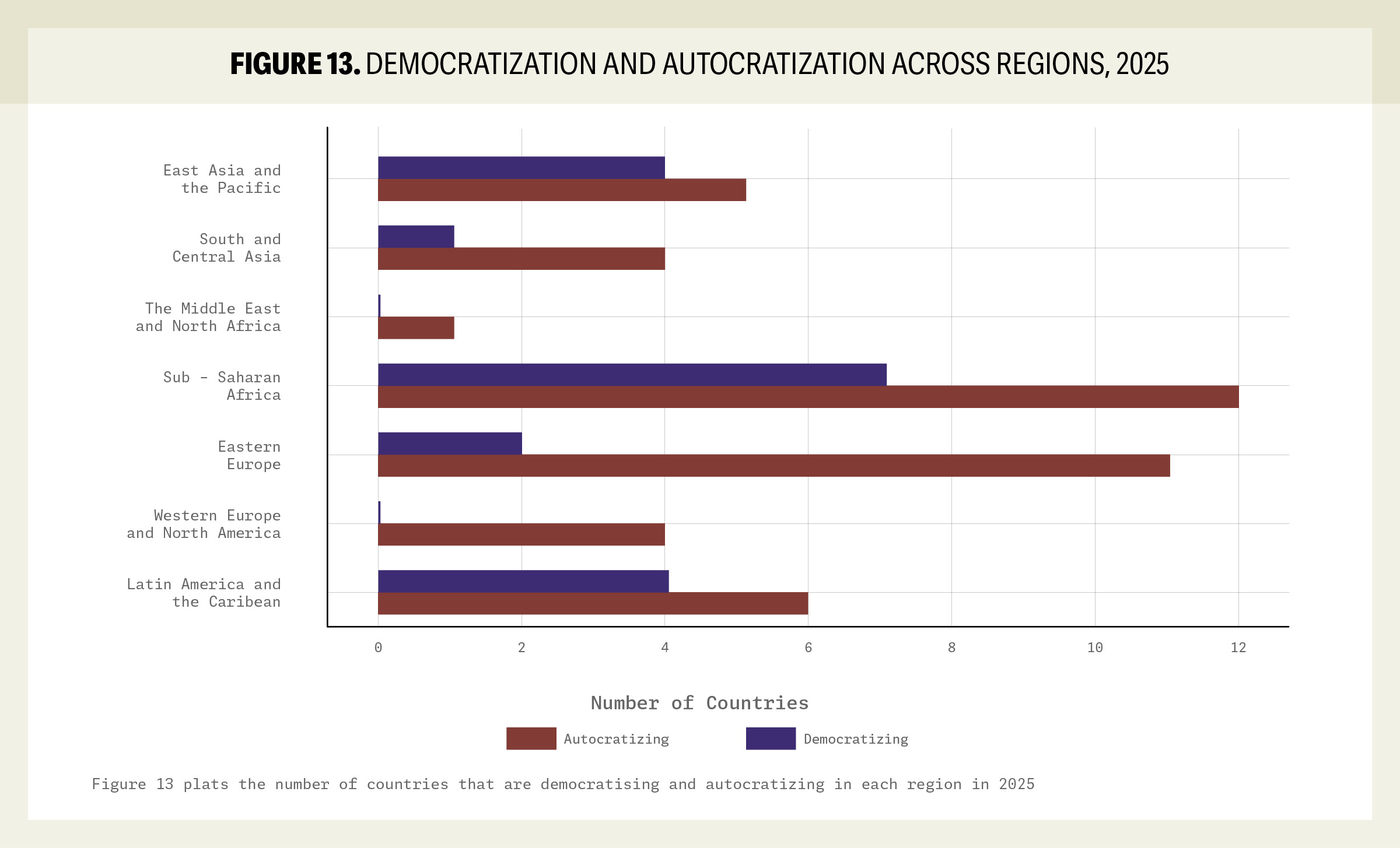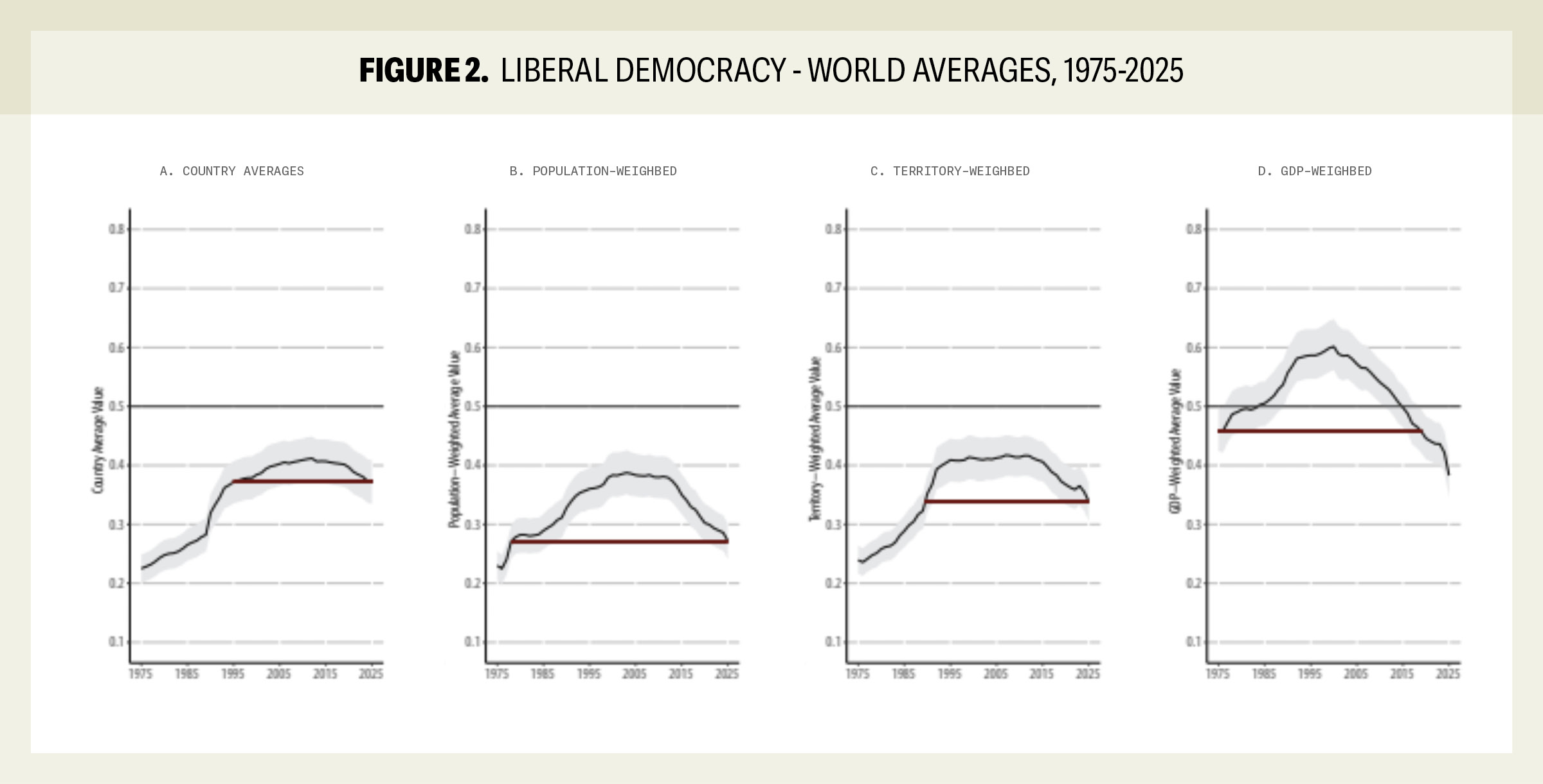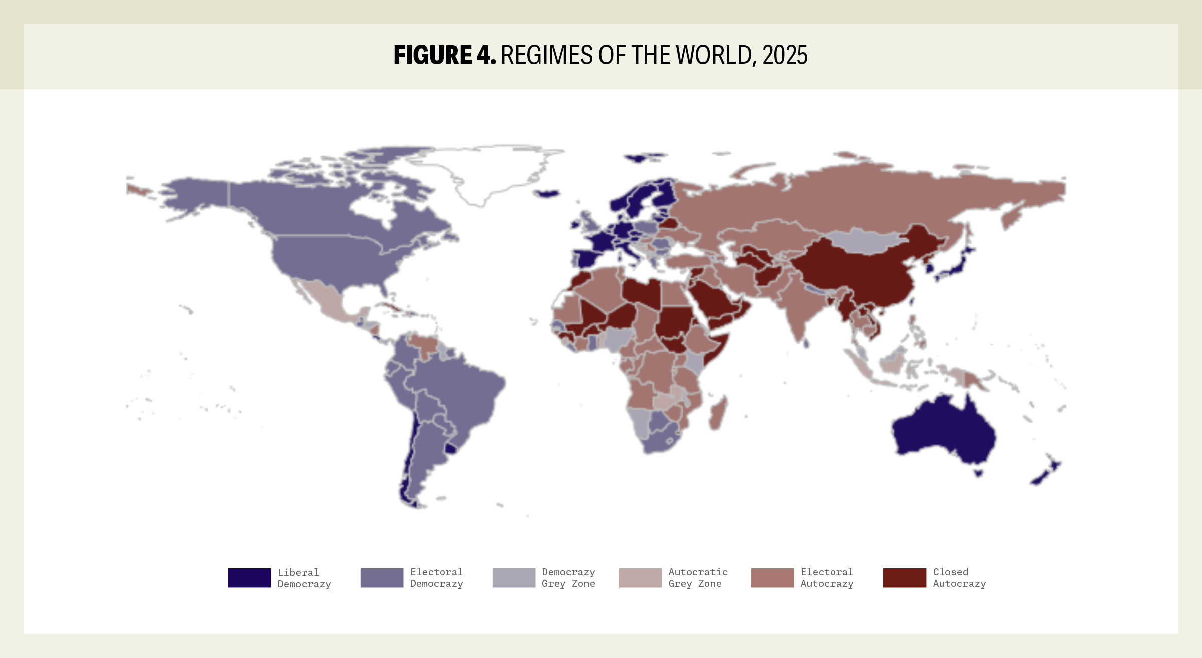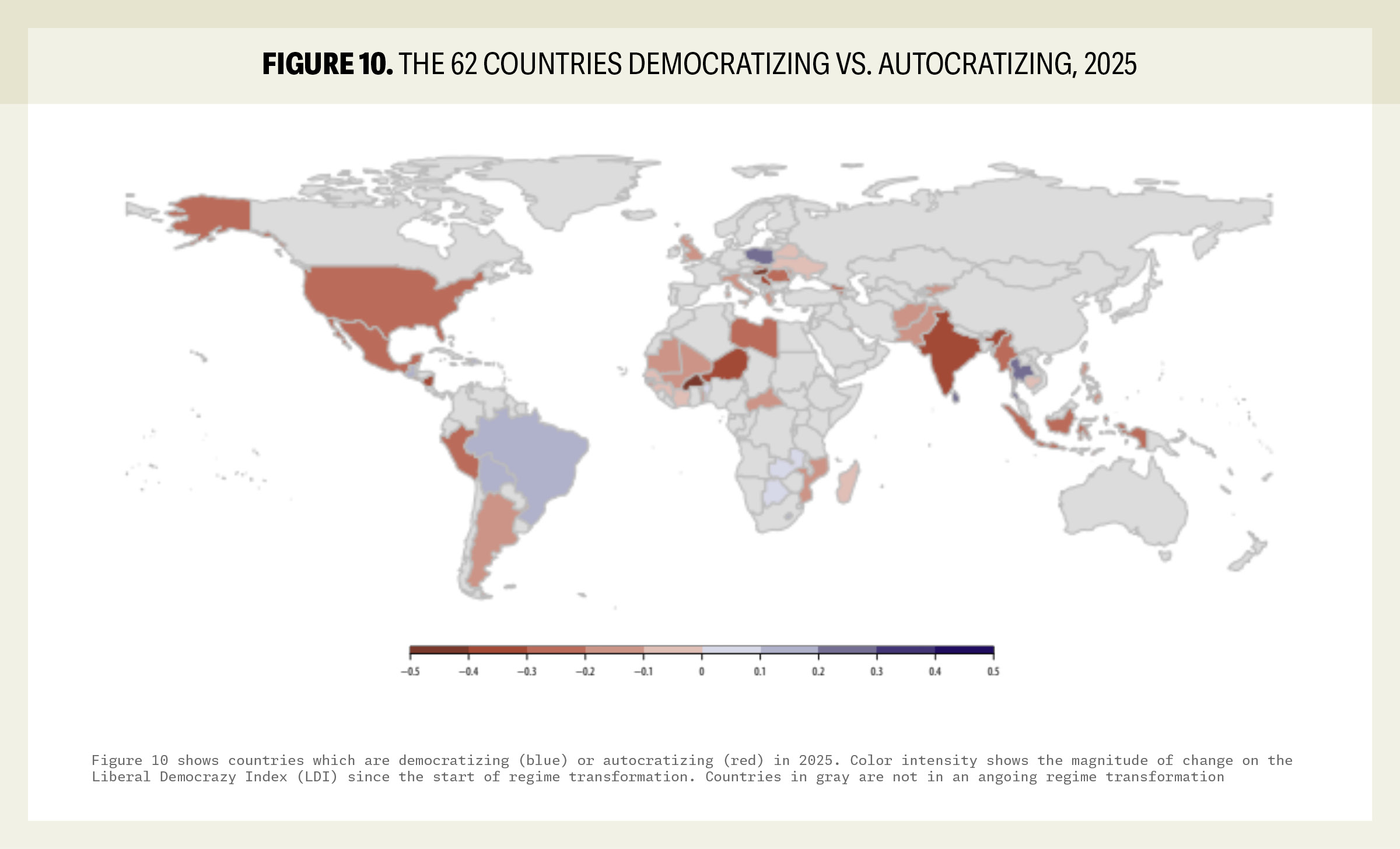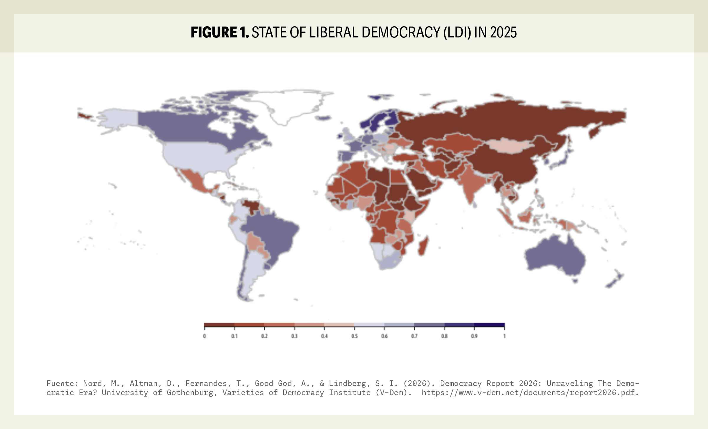 A nivel global, el nivel de democracia disfrutado por el ciudadano promedio en 2025 ha retrocedido a niveles no vistos desde finales de la década de 1980, antes de la caída del Muro de Berlín. El informe destaca que la autocratización no es un fenómeno aislado de naciones pequeñas, sino que ha penetrado en potencias regionales y economías del G20, lo que altera el equilibrio de poder geopolítico y debilita la capacidad de las instituciones internacionales para defender los derechos humanos (p. 8).