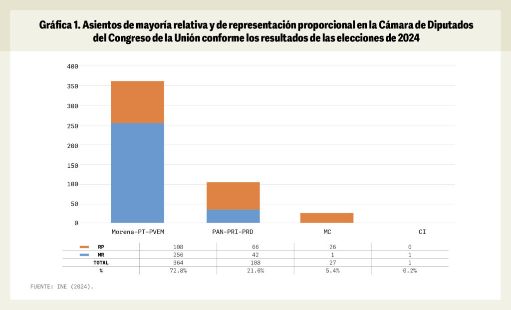 Ahora bien, el reparto actual de curules por partido o bloque de partidos no se vería afectada por las nuevas disposiciones, dado que el tope de 8 puntos porcentuales para la sobrerrepresentación en la Cámara de Diputados se establece en el Artículo 54, fracción V de la Constitución Política de los Estados Unidos Mexicanos (CPEUM), misma que no se modificaría y que da por resultado los repartos que se presentan en la Gráfica 1 que acompaña este texto.